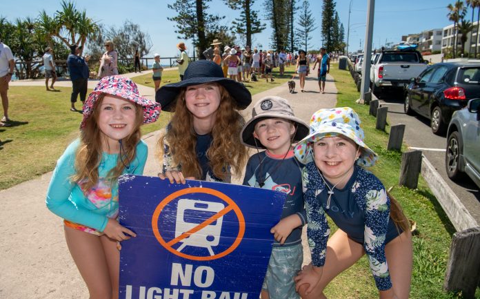 On a perfect spring day, locals and visitors of all ages strolled the foreshore holding “No Light Rail’’, “Tell The Council Now” and “Don’t Make Us The Gold Coast” signs.