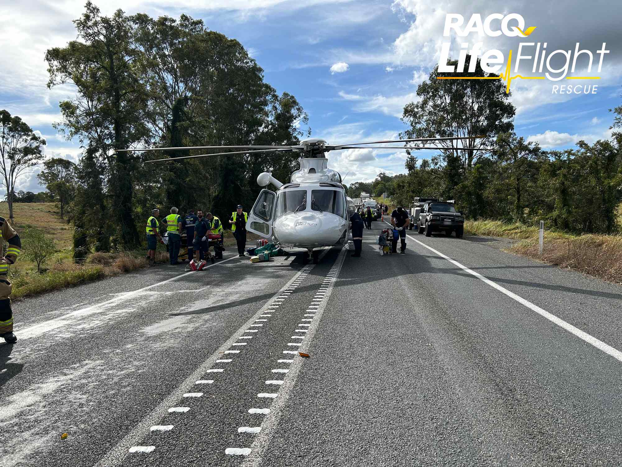 The Sunshine Coast-based RACQ LifeFlight Rescue crew was tasked to the incident about 5pm and the pilot landed the chopper on the road near the scene, where multiple emergency crews were in attendance.