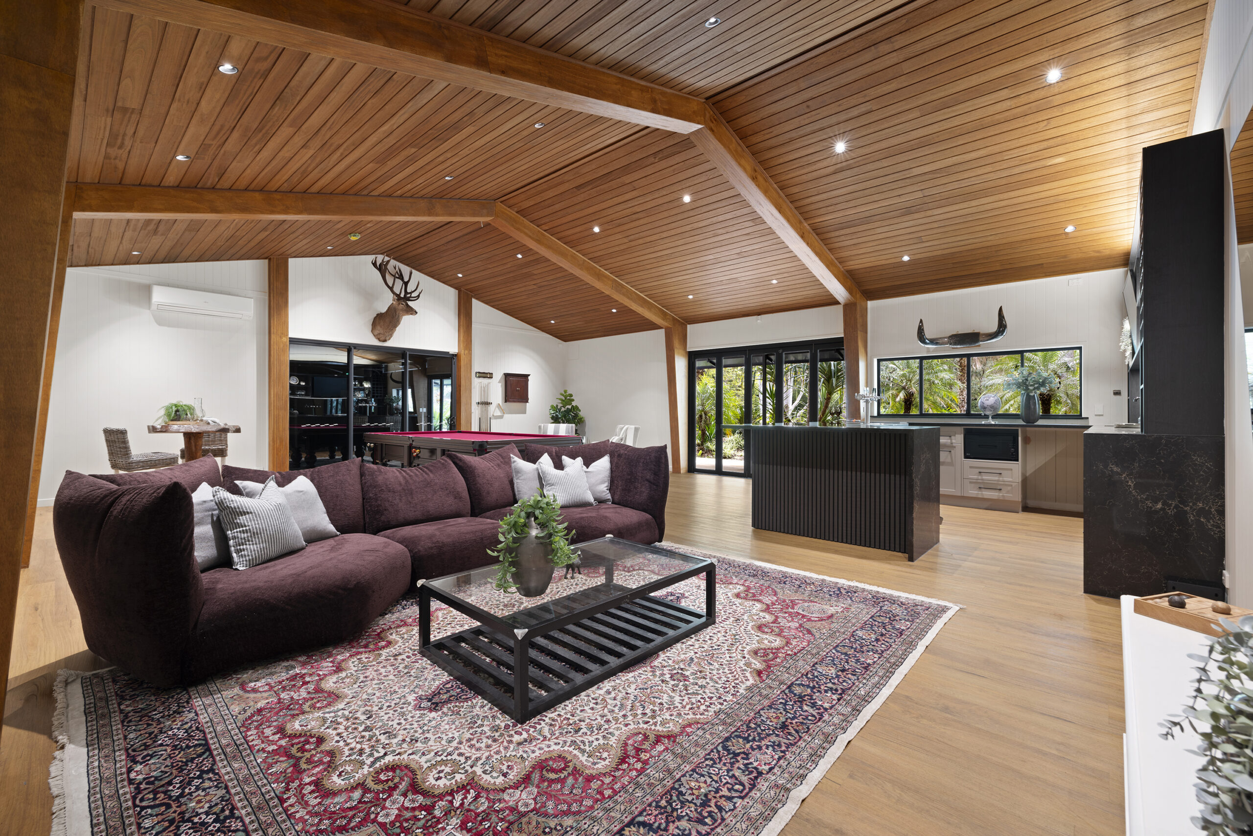 The property includes the pavilion-style main residence designed across two wings with five bedrooms, three bathrooms, a home office, media room and multiple living zones.