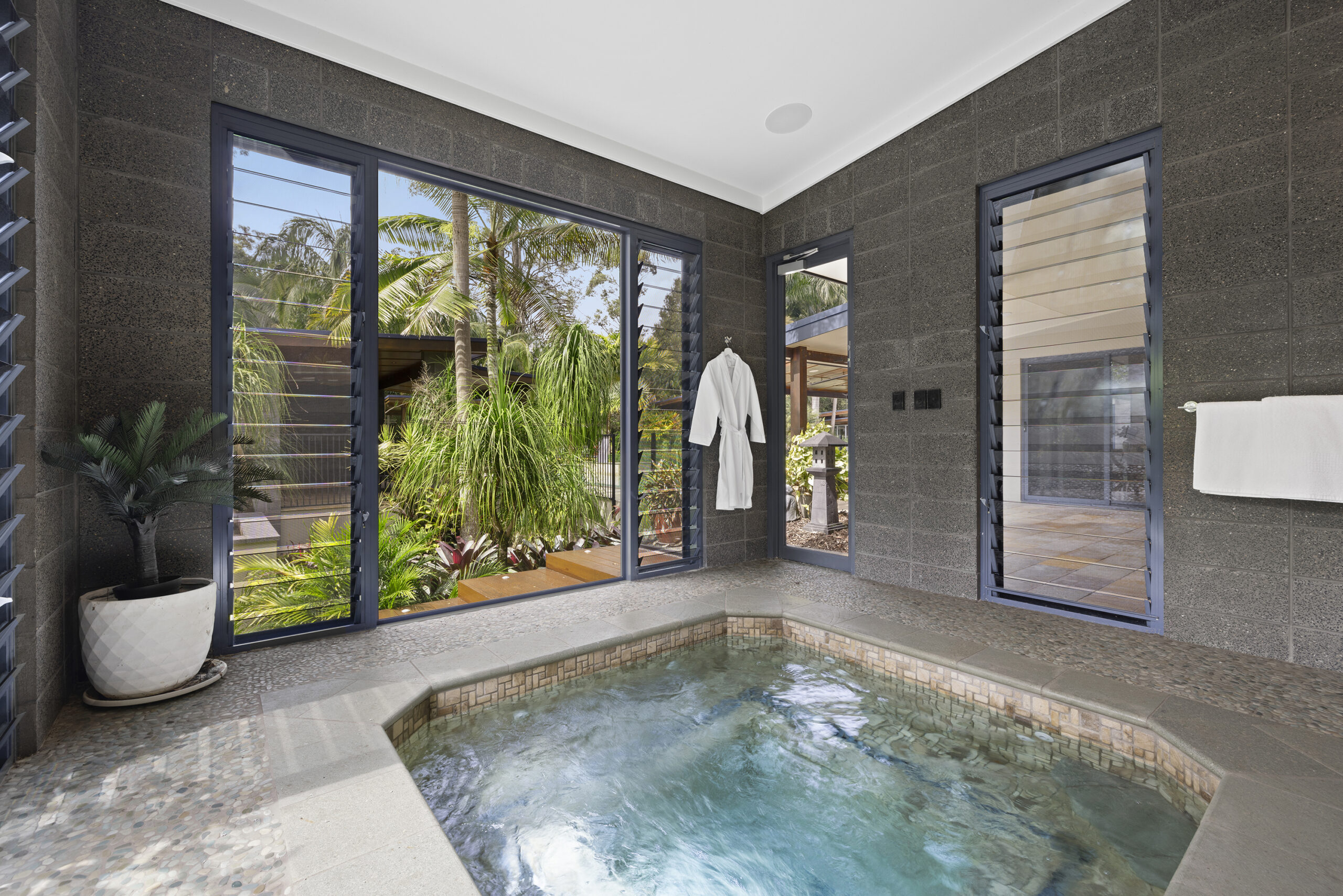 Complete with a pool, spa, gym, tennis court, bar and guest house, the property sits on just under two hectares at 55 Rainforest Road, Tanawha.