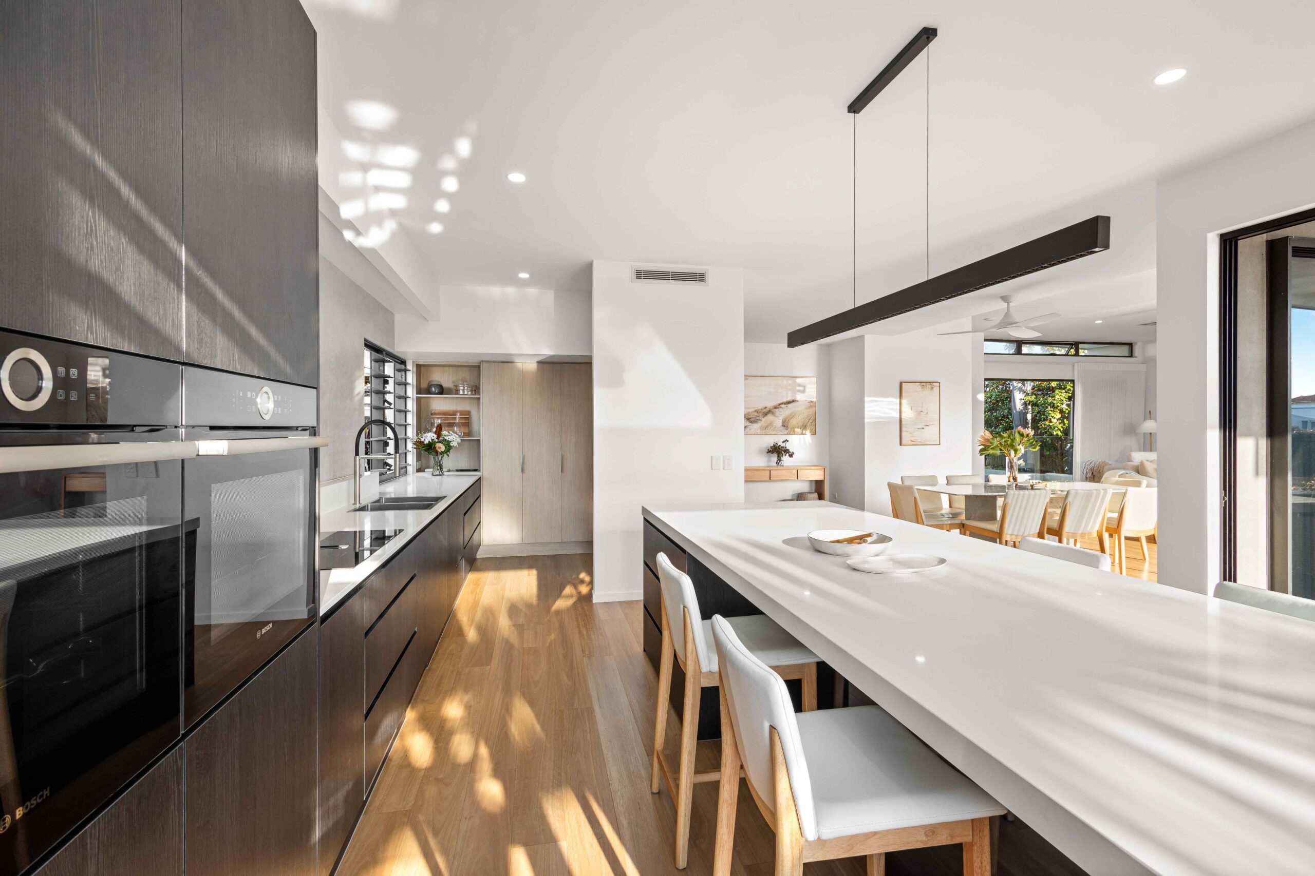 The stylish kitchen has a walk-in pantry, modern appliances, stone benchtops and ample storage.