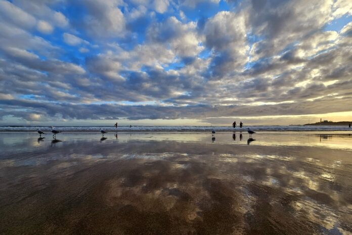 Helen Browne captured this stunning mirrored reflection of the sky in the wet sand at Mooloolaba Beach.