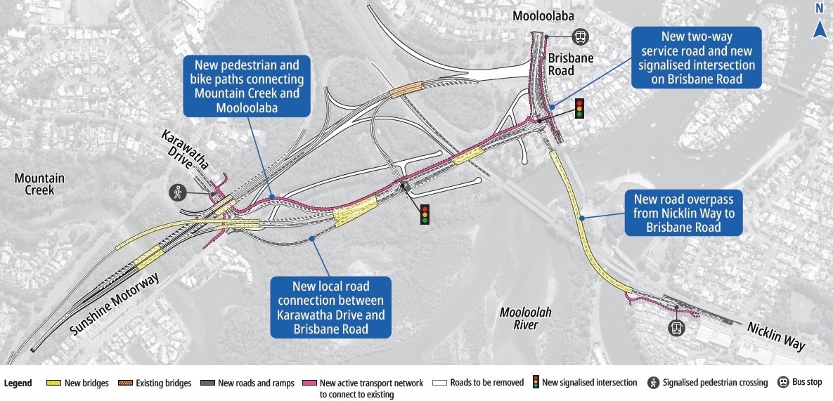 The MRIU project will include a new road overpass from Nicklin Way to Brisbane Road at Mooloolaba, new local road connection between Karawatha Drive and Brisbane Road, duplication of a section of the Sunshine Motorway and a link road from the motorway to Kawana Way.