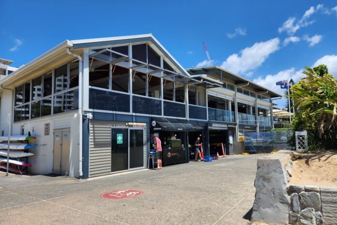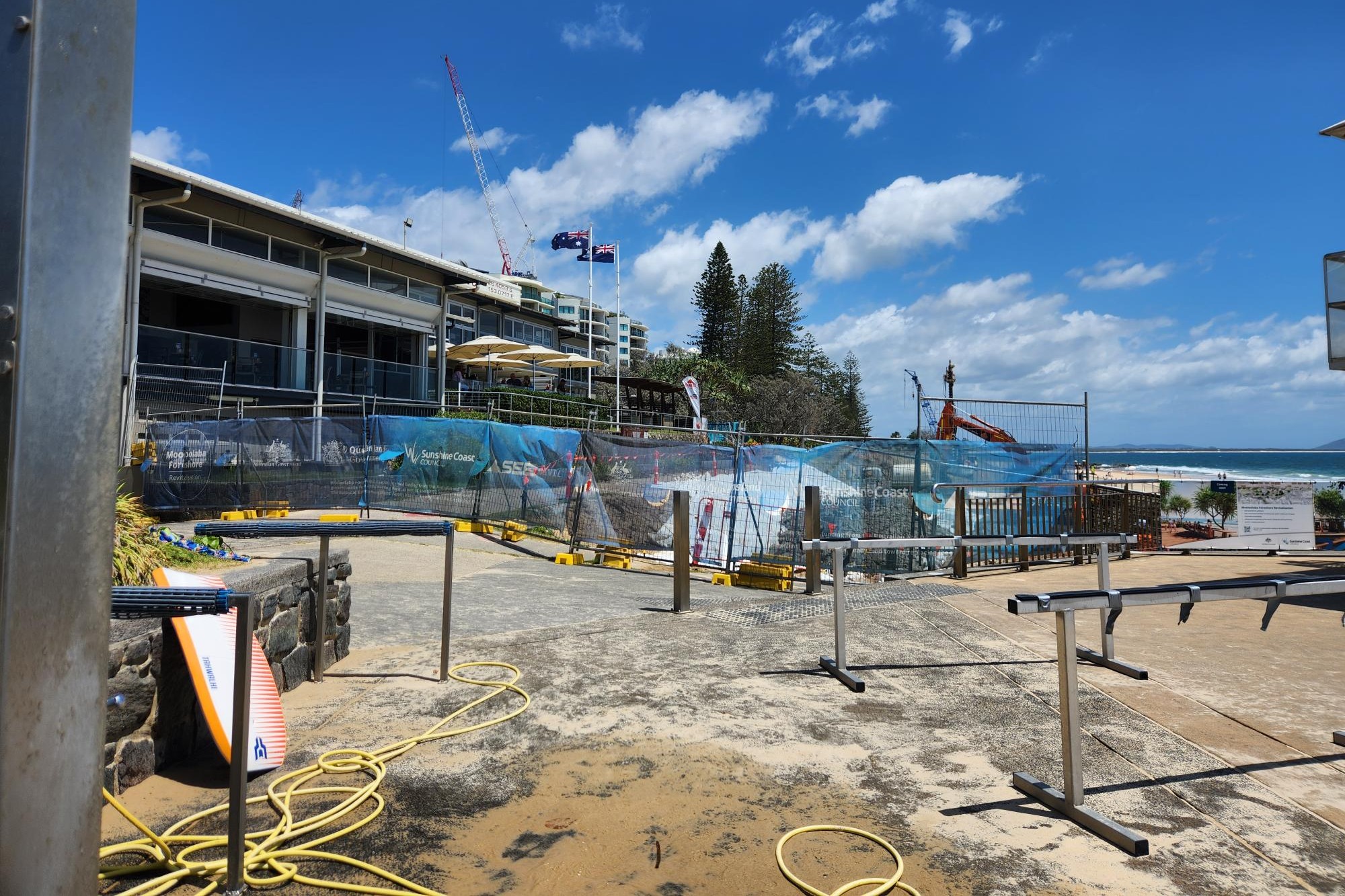 Work on the Mooloolaba Foreshore Revitalisation Project is ongoing nearby, with the coastal pathway to the north of the surf club and coffee shop currently blocked by a safety fence.
