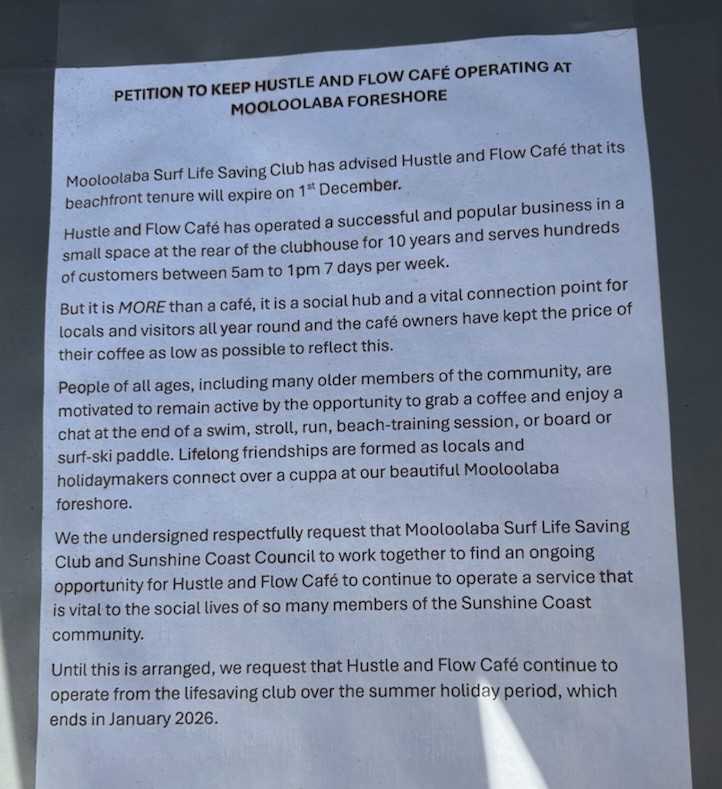 “We the undersigned respectfully request that Mooloolaba Surf Life Saving Club and Sunshine Coast Council to work together to find an ongoing opportunity for Hustle and Flow Cafe to continue to operate a service that is vital to the social lives of so many members of the Sunshine Coast community,” it says.