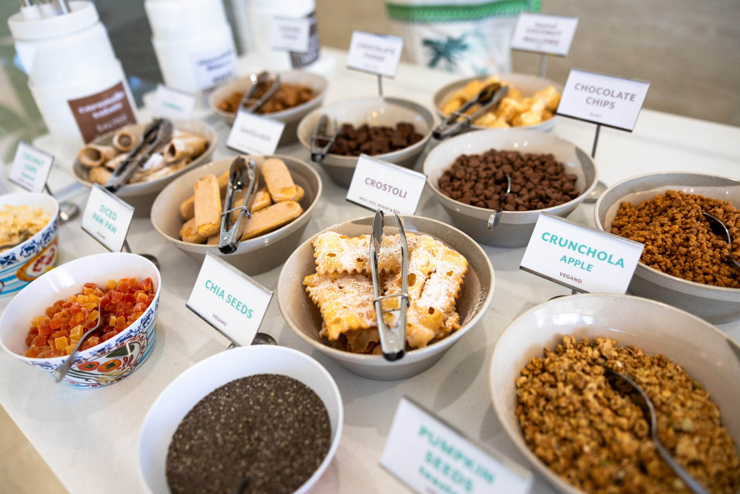 Flavours on offer so far include mango estivo (summer mango), caramello salato (salted caramel), fragola (strawberry) and classico (classic vanilla), with crostoli (flaky Sicilian pastry) and Dubai chocolate sauce among the toppings.