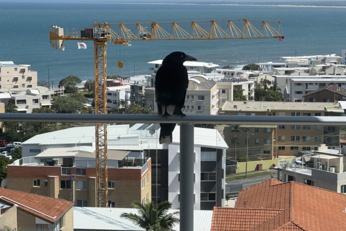 A pied currawong checks out the latest crane on the Kings Beach horizon. Photograph by Lesley Evans.