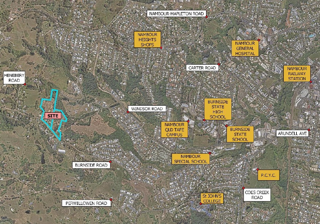 The site sits within the Emerging Community Zone of the Nambour Local Plan area, with neighbouring properties also at various stages of residential development. To the north-east Stage 2 of the Windsor Park estate has recently been completed, while a 36-lot subdivision at Henebery Road to the north-west has approval for operational works. To the west the council is assessing a separate 58-lot proposal on land zoned for Community Facilities.