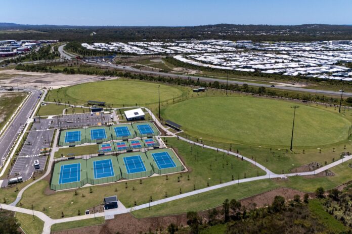 The Baringa facility spans 7.5 hectares and features two full-size AFL fields, eight tennis courts, four pickleball courts and extensive shaded seating for spectators, along with lighting for night games.