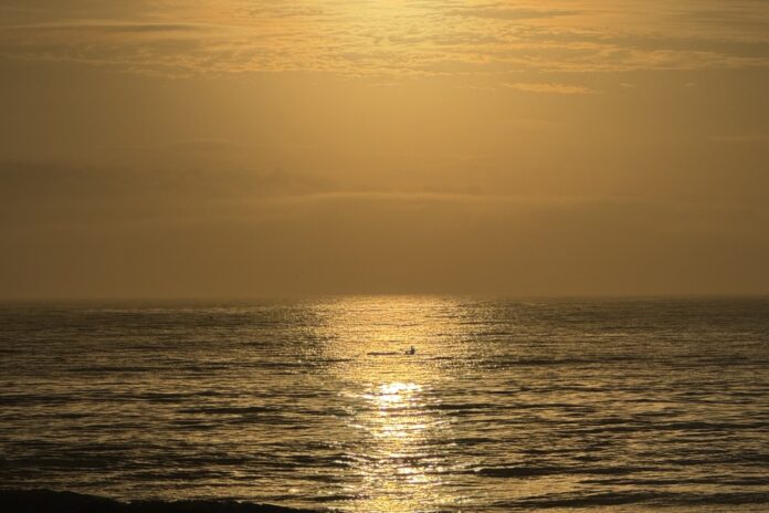 An early morning paddler “suspended” in a golden orb of light off Caloundra. Photographer: Lesley Evans.