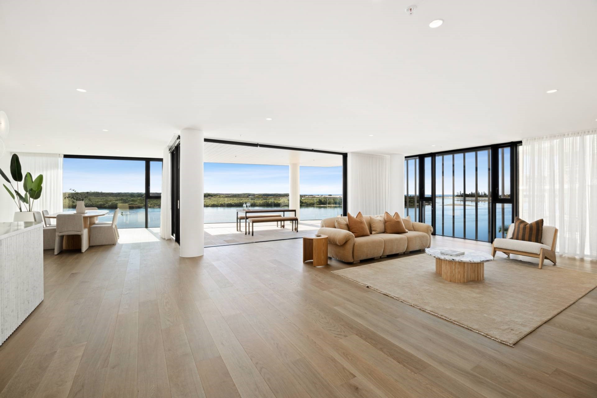 The level-four apartment features three ensuite bedrooms, two living areas, a study nook and private rear balconies with views across the Maroochy River, river mouth and out to the Pacific Ocean.