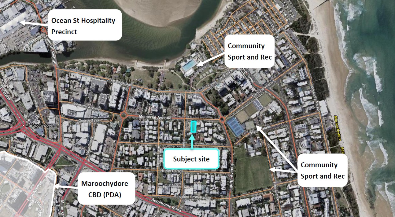 “The site is located within close proximity to the central business district of Maroochydore, with the Ocean Street hospitality precinct located 730m north-west of the site and the new Maroochydore city centre Priority Development Area (PDA) being located 530m south-west of the site. Further, the site is located within walking distance (260m) of the Cotton Tree local centre.”