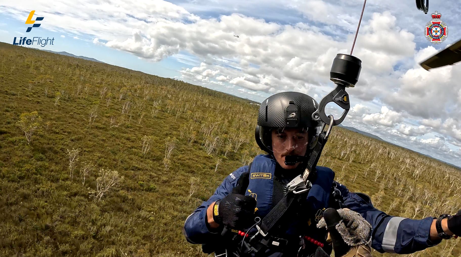 The LifeFlight rescue crewman and QAS flight paramedic were lowered to the scene and put harnesses on both patients before winching them into the helicopter.