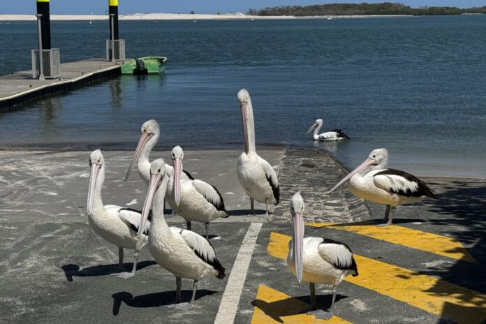A scoop of pelicans waiting for remnants from fishermen’s catch of the day. Photographer: Lesley Evans.