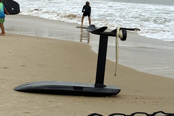 A stunned surfer’s e-foil ride was interrupted by an unexpected snake on a popular Coast beach on January 23.