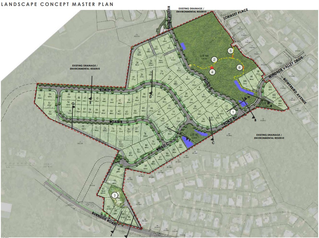 Access to the development is proposed from Windsor Valley Drive, Hilltop Drive and Burnside Road. Site plans show four new streets within the subdivision.