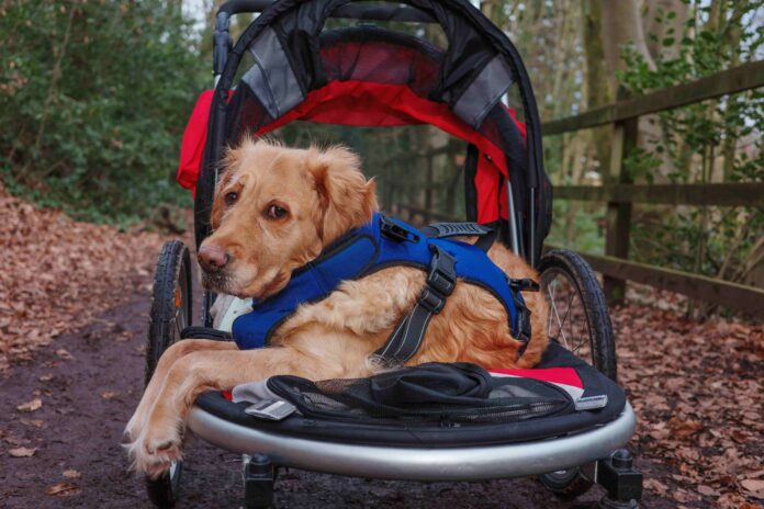 A person is pushing a stroller with a dog in it. A woman has visible underarm hair. A person utters a particular word. A parent lets their little boy grow his hair or a person has a lot of facial piercings.