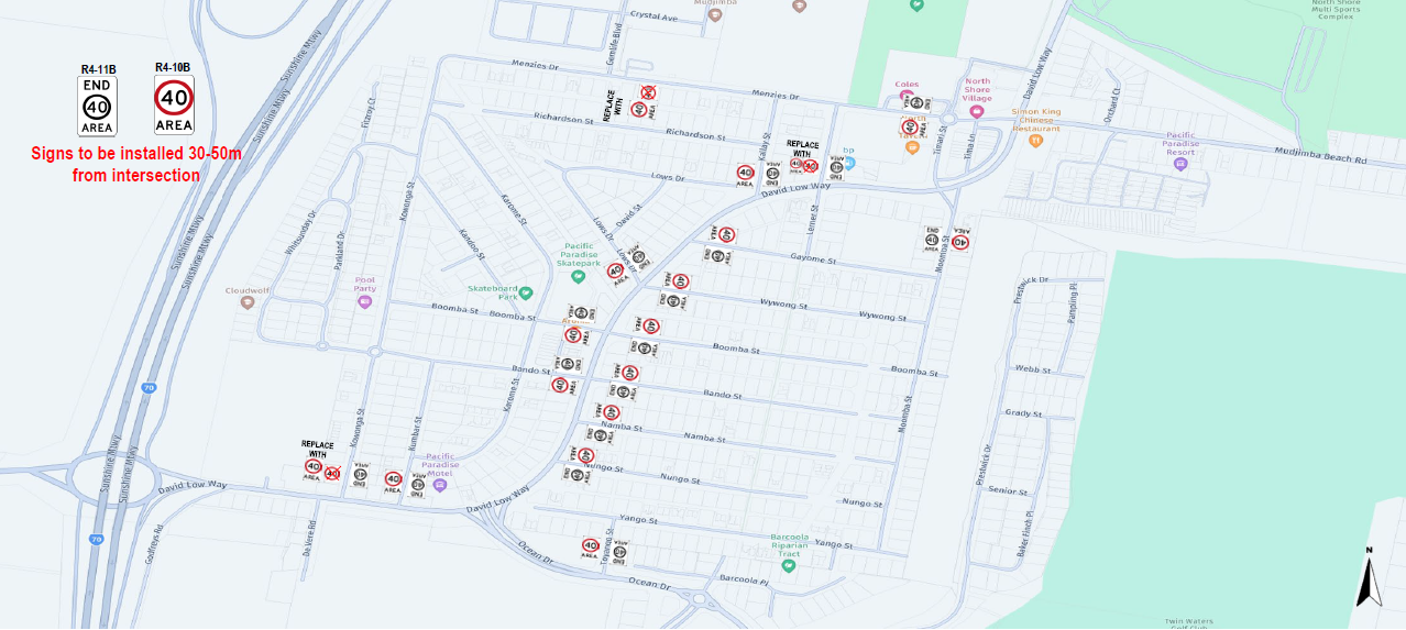 Locations of 40km/h signs to be erected in Pacific Paradise.