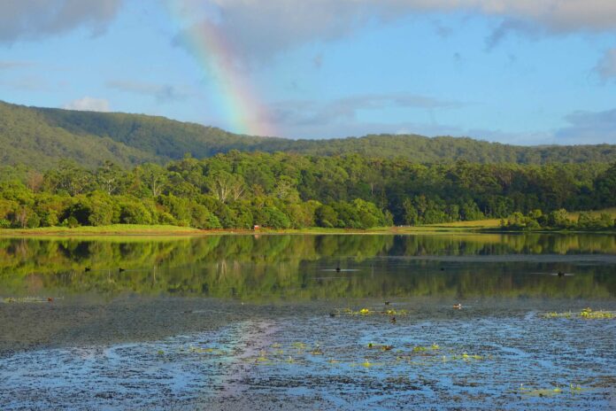 Is there a pot of gold waiting at the end of the rainbow? Well… it’s a nice thought. Photographer Sandy Gillis ‘caught’ this rainbow over Wappa Dam reflected among the lily pads and pond weed.