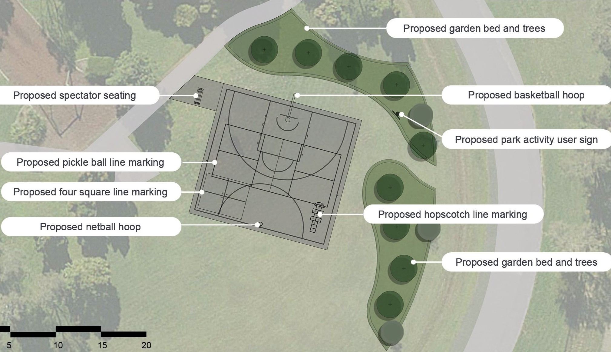 The concept plan includes a basketball hoop, netball hoop and line marking for pickleball, hopscotch and four square, along with seating and additional shade planting to improve comfort and amenity.