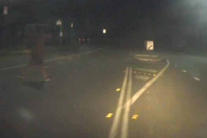 Dash-cam footage shows the pedestrian crossing the two-lane road without using a pedestrian refuge island located in the centre median.