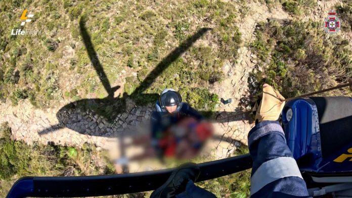 A LifeFlight rescue crew officer and critical care QAS flight paramedic were then winched down to the patient, who was lifted back into the helicopter.