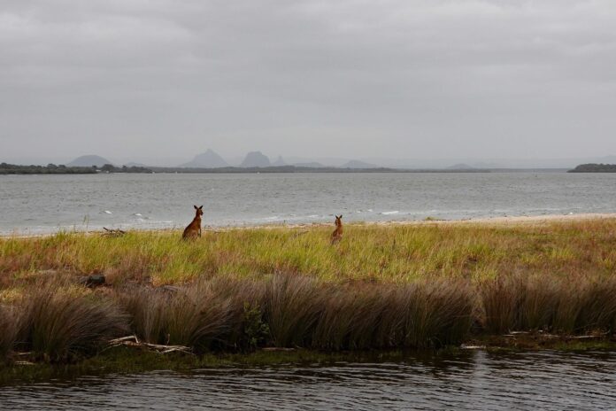 “On a gloomy day on Bribie Island, a couple of eastern grey kangaroos found the Glasshouse Mountains of great interest,” photographer Sandy Gillis writes.