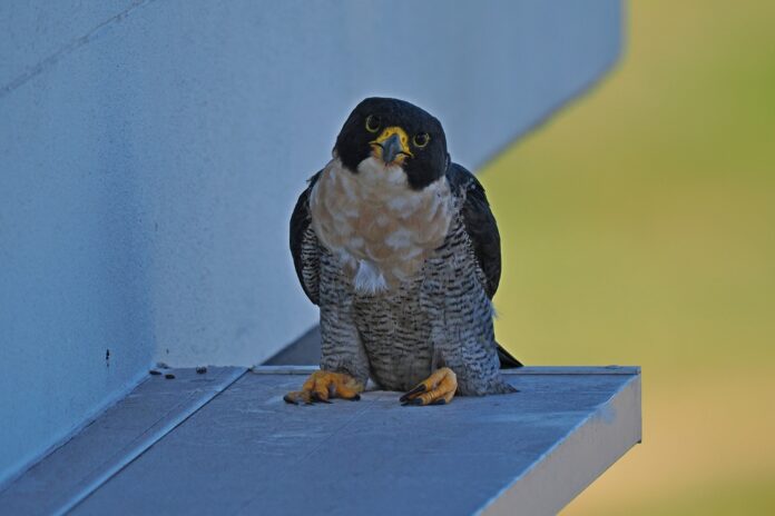 Photographer Dick Midgely surmises this Peregrine Falcon on a window ledge in Maroochydore’s CBD had just finished breakfast.