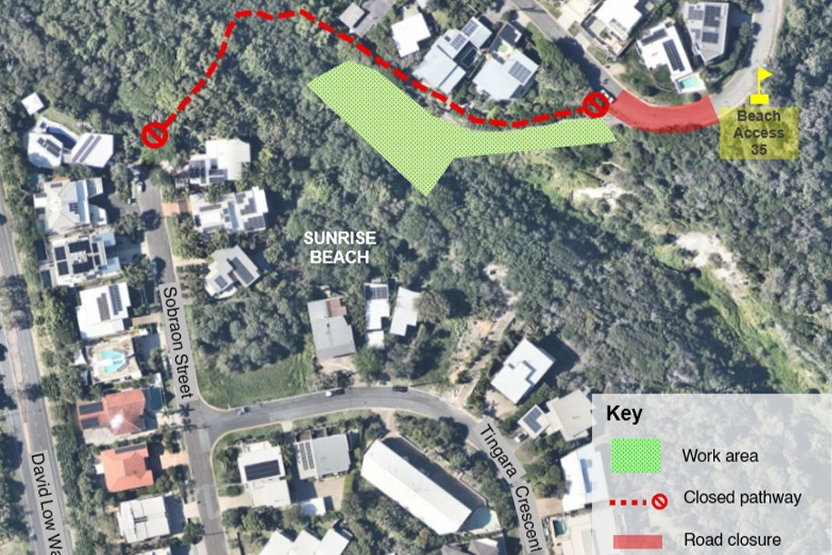 Residents and visitors can expect: a road closure near the pathway entrance; closure of the pathway between Sobraon Street and Adams Street/Ross Crescent; reduced speed limits and active traffic control in the area; and short-term, intermittent closures of Beach Access 35 for public safety.