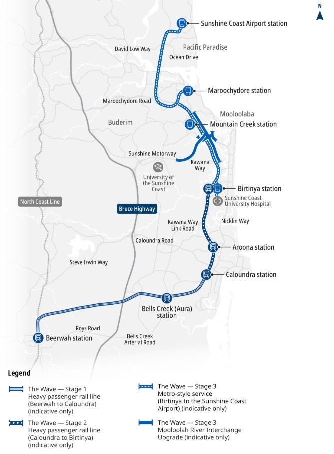 The Wave will include a dual train track, delivered in two stages, from Beerwah to Caloundra and from Caloundra to Birtinya, and a metro vehicle public transport system from Birtinya to Sunshine Coast Airport.