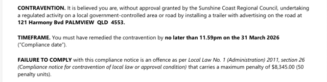 Palmview agent Reagan Genrich has been issued a compliance notice by Sunshine Coast Council requiring him to remove a trailer parked on Harmony Boulevard or face fines of up to $8345.