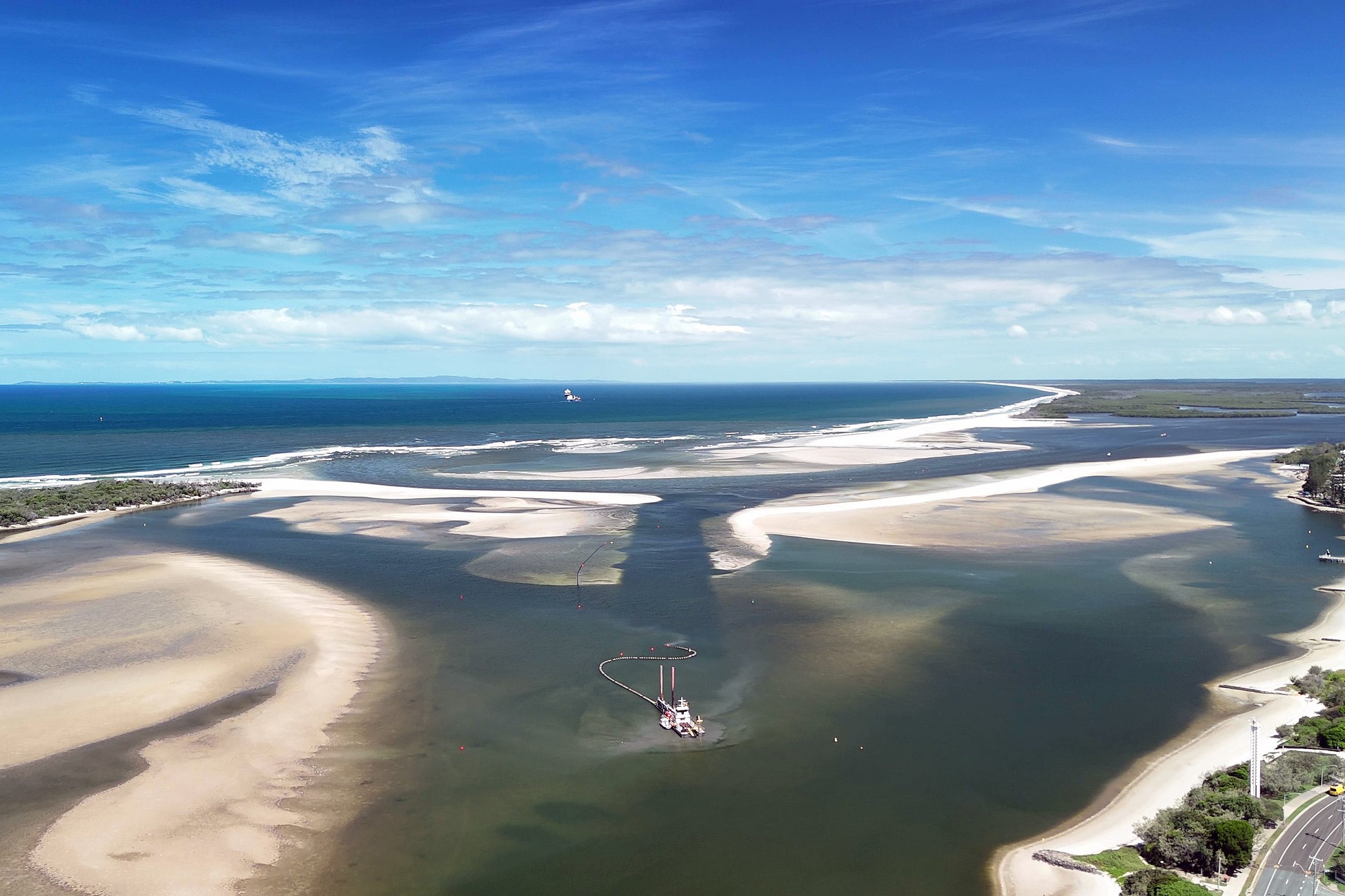 The Bribie Island breakthrough and northern reaches of the Pumicestone Passage. Picture: Damien Lange, Droner.au