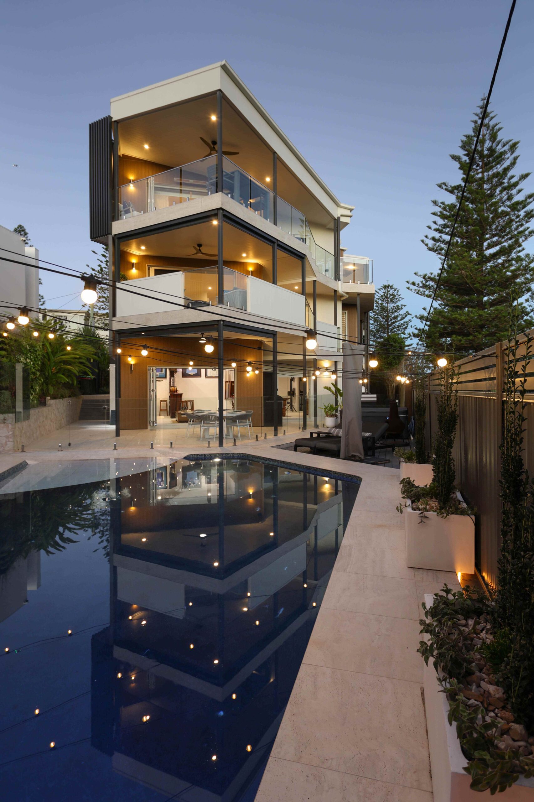 Externally, a private pool framed by landscaped gardens offers a more intimate retreat, while the home’s striking facade and stone entry deliver strong street appeal and a sense of arrival.