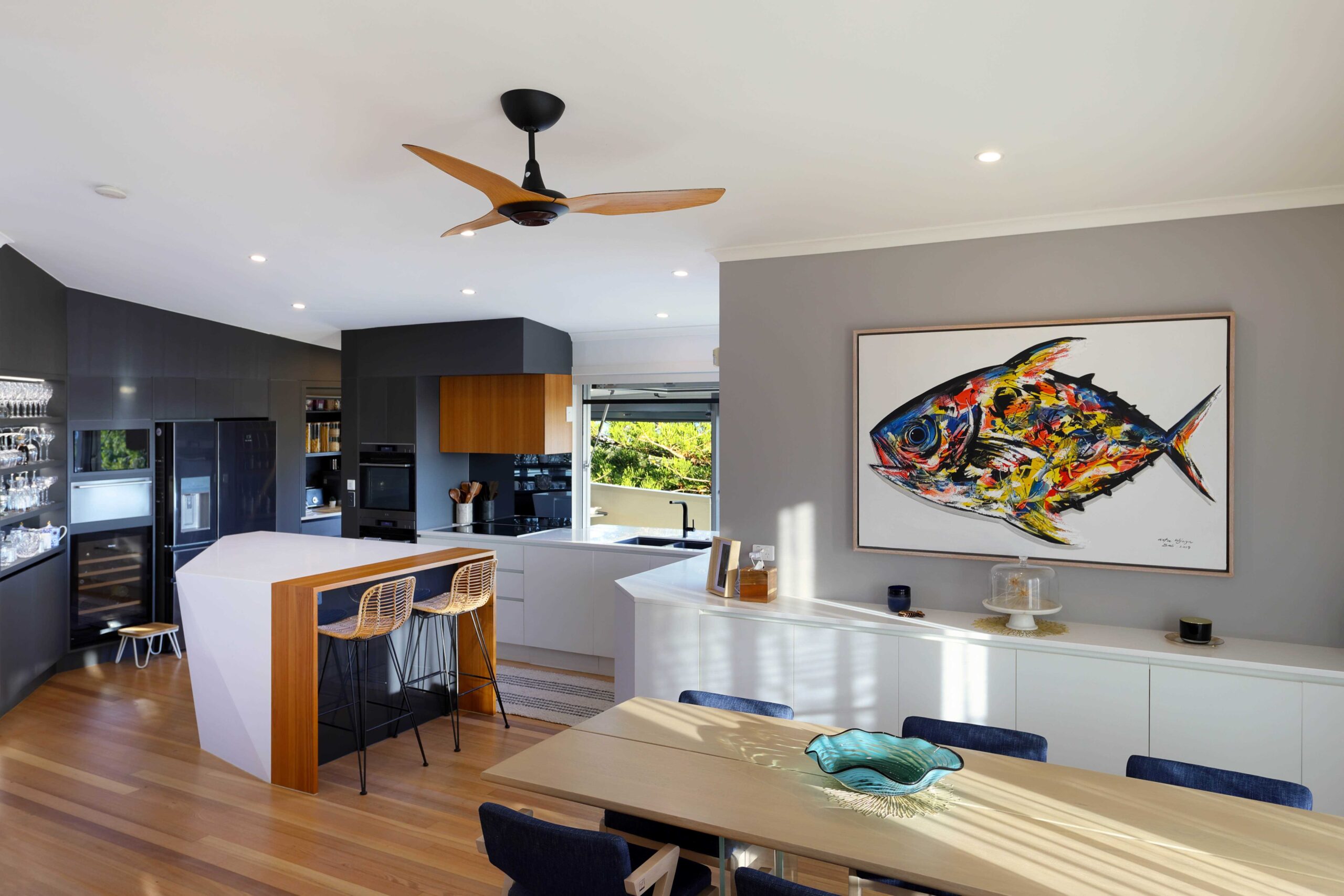 The 534sqm four-bedroom, three-bathroom, two-car residence has been meticulously renovated by Luna Constructions, led by John Anderson, with a strong emphasis on maximising its elevated position and outlook. The redesign brings in natural light, cooling sea breezes and expansive views across the marina, Mooloolah River, hinterland and ocean.
