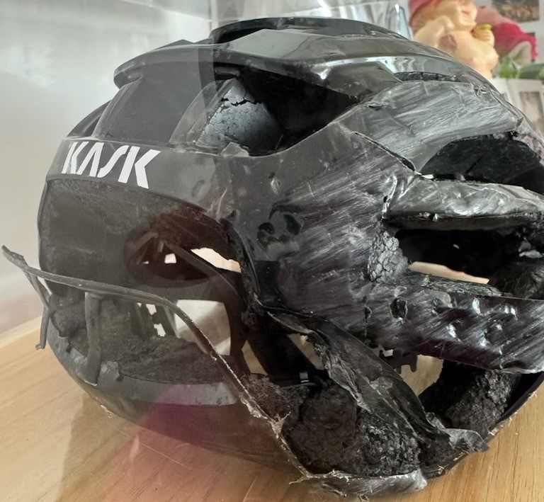 “I came down a very big hill going 70km/h and I clipped the wheel in front of me and I went smack on the right side first, and then my helmet flung off, and I went smash on my left side,” Ms Leary said of the accident.