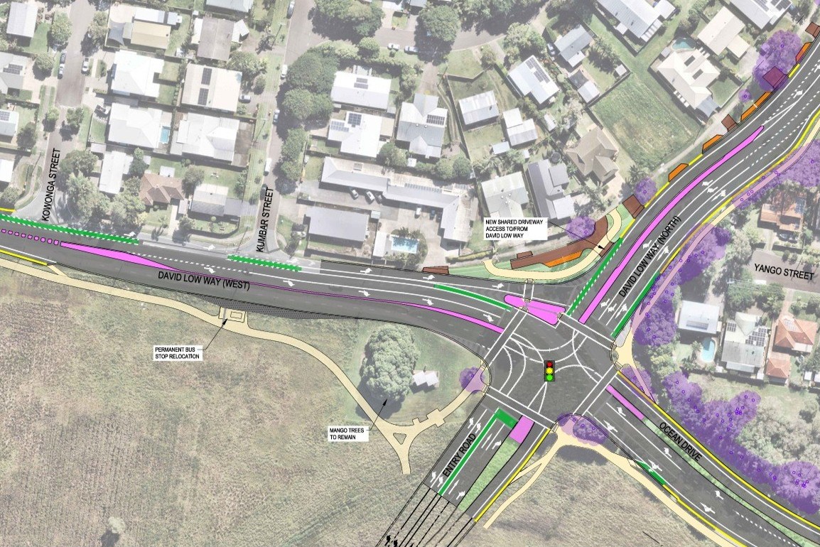 The T-junction of David Low Way and Ocean Drive, at Twin Waters, will be turned into a major four-way crossroads with traffic lights.